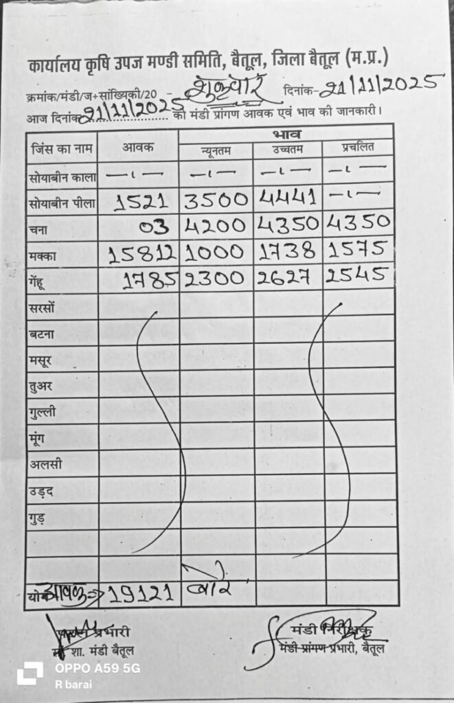 Aaj Ka Mandi Bhav: देखे Betul कृषि उपज मंडी भाव 21 नवंबर 2025