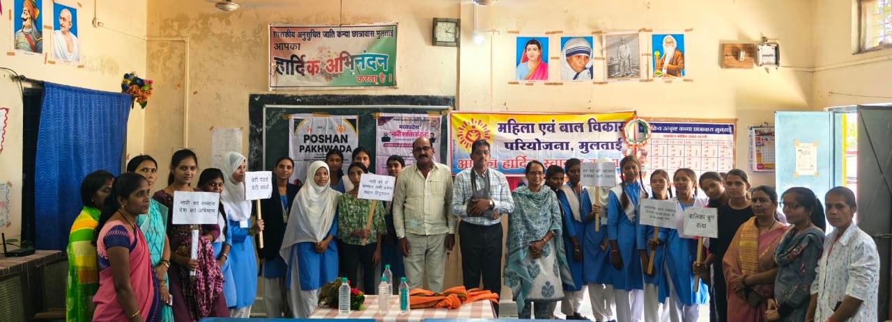 Betul Daily News/मुलताई। शासकीय अनुसूचित जाति कन्या छात्रावास में गुरुवार 16 अप्रैल को पोषण पखवाड़ा एवं नारी शक्ति वंदन पखवाड़ा के अंतर्गत जागरूकता कार्यक्रम आयोजित किया गया। कार्यक्रम में पार्षद महेंद्र जैन, नगर विकास प्रस्फुटन समिति अध्यक्ष एवं गायत्री परिवार के कार्यकर्ता नारायण देशमुख तथा परियोजना अधिकारी गीता मालवीय विशेष रूप से उपस्थित रहे। अतिथियों ने बालिकाओं को आत्मनिर्भरता, संतुलित पोषण और स्वास्थ्य शिक्षा के महत्व पर विस्तृत जानकारी दी।
