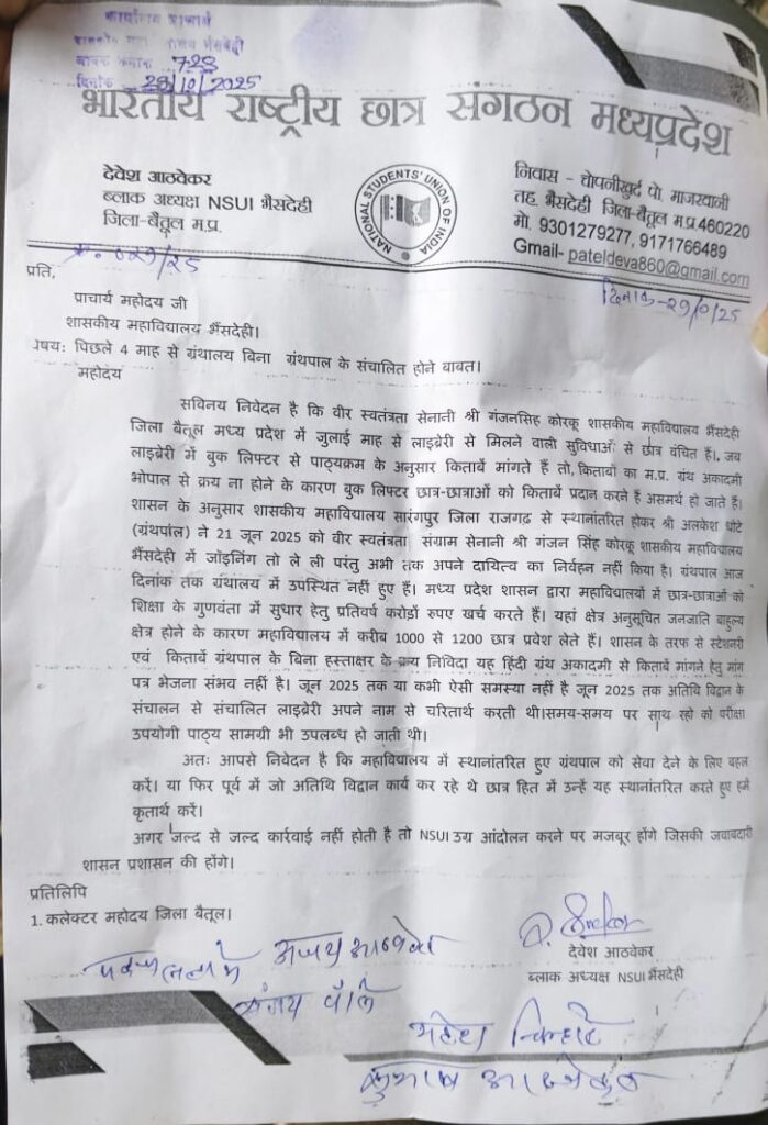 Betul Ki Khabar/भैंसदेही/मनीष राठौर :- भैंसदेही में वीर स्वतंत्रता सेनानी श्री गंजनसिंह कोरकू शासकीय महाविद्यालय, भैंसदेही में पिछले चार महीनों से ग्रंथालय बिना ग्रंथपाल के संचालित हो रहा है। इस स्थिति के कारण छात्र-छात्राएं पाठ्यक्रम से संबंधित किताबों से वंचित हैं और अध्ययन में कठिनाई का सामना कर रहे हैं।जानकारी के अनुसार, शासन के आदेशानुसार शासकीय महाविद्यालय सारंगपुर, जिला राजगढ़ से स्थानांतरित होकर आए ग्रंथपाल श्री अलकेश धोटे ने 21 जून 2025 को भैंसदेही कॉलेज में पदभार तो ग्रहण कर लिया, पर उन्होंने अब तक अपने दायित्वों का निर्वहन शुरू नहीं किया है। ग्रंथपाल की अनुपस्थिति के कारण कॉलेज में किताबों की खरीद और वितरण का कार्य ठप पड़ा हुआ है।छात्रों ने बताया कि लाइब्रेरी में बुक लिफ्टर के पास पुस्तकें नहीं हैं क्योंकि म.प्र. हिंदी ग्रंथ अकादमी, भोपाल से नई किताबों का क्रय नहीं हो पा रहा। ग्रंथपाल के हस्ताक्षर के अभाव में न तो क्रय निविदा जारी हो पा रही है और न ही मांग पत्र भेजा जा रहा है। इससे लगभग 1000 से 1200 छात्रों को अध्ययन सामग्री की कमी झेलनी पड़ रही है।छात्र संगठन NSUI ने चेतावनी दी है कि यदि शीघ्र ही कॉलेज में ग्रंथपाल की उपस्थिति सुनिश्चित नहीं की गई तो वे आंदोलन के लिए बाध्य होंगे। उन्होंने शासन-प्रशासन से मांग की है कि या तो स्थानांतरित ग्रंथपाल को जल्द कार्यभार संभालने के लिए निर्देश दिए जाएं या फिर पूर्व में कार्यरत अतिथि विद्वान को पुनः नियुक्त किया जाए।