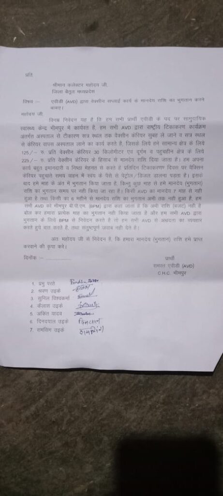 विनम्र निवेदन है कि हम सभी प्राथी एबीबी के पद पर सामुदायिक स्वास्थ्य केन्द्र भीमपुर में कार्यरत है, हम सभी AVD द्वारा राष्ट्रीय टिकाकरण कार्यक्रम अंतर्गत अस्पताल से टीकारण सत्र स्थल तक वैक्सीन करियर सुबह से जाने कः सत्र स्थल में कॅरियर वापस अस्पताल लाने का कार्य करते है जिसके लिये हमें सामान्य क्षेत्र के लिये 125/- रु प्रति वैक्सीन कॅरियर 30 किलोमीटर एवं दूर्गम व पहुंचहीन क्षेत्र के लियं 225/- प्रति वैक्सीन केरियर के हिसाब से मानदेय राशि दिया जाता है। हम अपना कार्य बहुत इमानदारी व निष्ठा मेहनत से करते है प्रतिदिन टिकाकरण दिवस पर वैक्सिन करियर पहुंचाते समय वाहन में स्वय के पैसे से पेट्रोल डीजल डालना पड़ता है। इसके बाद हमें माह के अंत में भुगतान किया जाता है. किन्तु कुछ माह से हमें मानदेय (मुगतान) राशि का भुगतान समय पर नहीं किया जा रहा है। किती AVD का मानदेय माह से नहीं हुजा है तथा किसी का महीने से मानदेय राशि का भुगतान अभी तक नहीं हुआ है, हम सभी AVD को भीमपुर बी पी एम. (BPM) द्वारा कहा जाता है कि अभी राशि (बजट) नहीं है पॉल कर हमारा प्रत्येक माह का भुगतान नही किया जाता है और हम सगी AVD द्वारा सुस्तान के लिये BPM से निवेदन करते है तो हम सभी AVD असपता का व्यवहार करते हुये बात करते हैं तथा संतुष्टपूर्ण सब नहीं देते हैं।