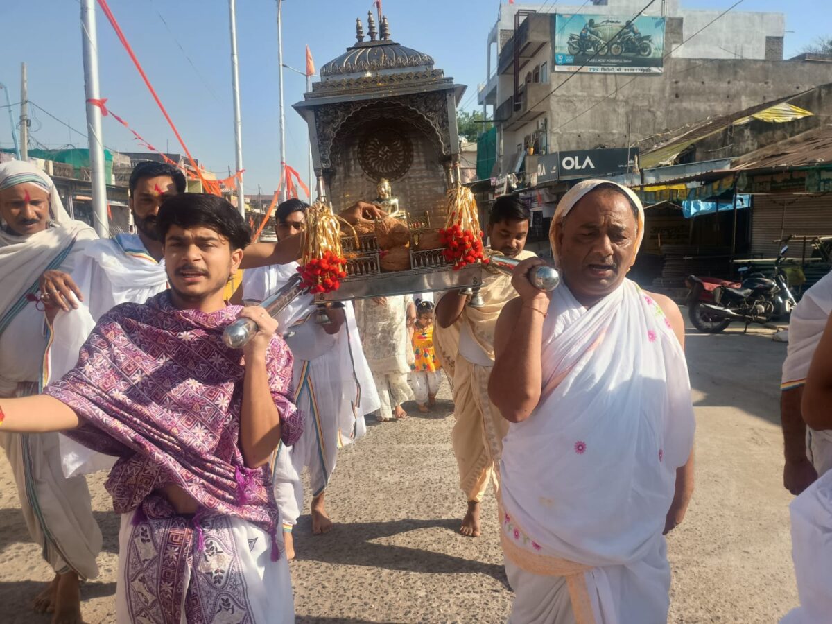 Betul Ki Khabar/चिचोली। सकल जैन समाज की ओर से 24वें तीर्थंकर भगवान महावीर स्वामी का जन्म कल्याणक महोत्सव श्रद्धा और उल्लास के साथ मनाया गया। कार्यक्रम आर्यिका रत्न विरम्या माताजी एवं आर्यिका रत्न विसंयोजना माताजी के सानिध्य में संपन्न हुआ। इस अवसर पर नगर के अहिंसा चौक पर स्वास्तिक विशोभित धवल ध्वज फैराया गया । इसके पश्चात भगवान महावीर स्वामी की भव्य पालकी यात्रा निकाली गई, जो पार्श्वनाथ जैन मंदिर से प्रारंभ होकर बाजार चौक, बस स्टैंड, जय स्तंभ चौक होते हुए पुनः पार्श्वनाथ जैन मंदिर पहुंची।