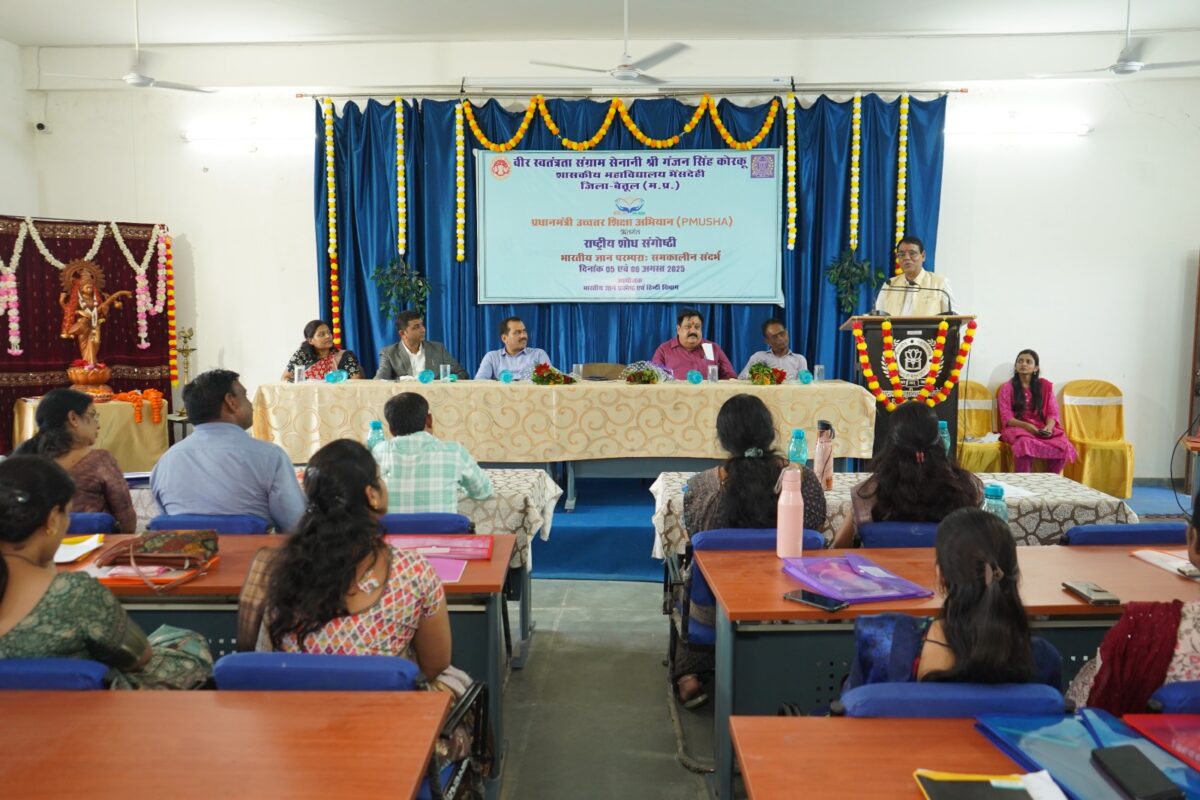BETUL NEWS/भैंसदेही (मनीष राठौर):- वीर स्वतंत्रता संग्राम सेनानी गंजन सिंह कोरकू शासकीय महाविद्यालय भैंसदेही में पीएम उषा परियोजना के अंतर्गत दो दिवसीय राष्ट्रीय संगोष्ठी संपन्न हुई। भारतीय ज्ञान परंपरा प्रकोष्ठ एवं हिंदी विभाग के तत्वाधान में आयोजित इस संगोष्ठी का शीर्षक भारतीय ज्ञान परंपरा : समकालीन संदर्भ था। संगोष्ठी के समापन सत्र में उच्च शिक्षा विभाग भोपाल नर्मदापुरम संभाग के अतिरिक्त संचालक डॉ मथुराप्रसाद मुख्य अतिथि के रूप में उपस्थित रहें। उन्होंने भैंसदेही महाविद्यालय में आयोजित की जा रही विभिन्न गतिविधियों की प्रशंसा करते हुए विद्यार्थियों से कहा कि आप सभी यहां उपलब्ध सुविधाओं का लाभ उठाएं। उन्होंने भारतीय ज्ञान परंपरा पर बात करते हुए कहा कि निरंतर विकास की राह पर आगे बढ़ते हुए भी हमारे लिए अपनी जड़ों से जुड़े रहना आवश्यक है। कार्यक्रम में विशिष्ट अतिथि के रूप में हंसराज कॉलेज दिल्ली विश्वविद्यालय के सहायक प्राध्यापक डॉ सुरेश गोहे उपस्थित रहें। उन्होंने अपने वक्तव्य में भारतीय ज्ञान परंपरा और क्षेत्रीय ज्ञान के संबंध में चर्चा की। विशिष्ट अतिथि के रूप में अतिरिक्त संचालक कार्यालय से विशेष कर्तव्यस्थ अधिकारी डॉ अशोक शर्मा भी उपस्थित रहें।