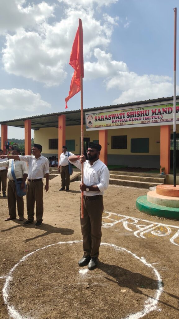 BETUL NEWS/कोथलकुण्ड (आशुतोष त्रिवेदी) :- राष्ट्रीय स्वयंसेवक संघ के के 100 वर्ष पूर्ण होने पर कोथलकुण्ड मंडल में भी आज पथ संचलन का आयोजन किया गया। संचलन का प्रारंभ कोथलकुण्ड के सरस्वती शिशु मंदिर से हुआ जिसका समापन ग्राम के पटेल चौक पर किया गया। जिसमें लगभग आधा सैकड़ा से अधिक स्वयंसेवक सम्मिलित रहे जिन्होंने संघ गीतों पर कदमताल करते हुए ग्राम का भ्रमण किया ग्रामीणों ने भी जगह-जगह पुष्पवर्षा कर संचलन का स्वागत किया गया उपस्थित स्वयंसेवको को संबोधित करते हुये मुख्य वक्ता आशुतोष चौहान द्वारा संघ कि स्थापना पर प्रकाश डालते हुए हिंदुओ को एकजुट होकर भारत को परम वैभव पर ले जाने की बात कही उन्होंने कहा कि सामाजिक वैमनस्यता फैलाने के प्रयास को भी हम सबको विफल करना है।पंच परिवर्तन जिसमे सामाजिक समरसता,कुटुंब प्रबोधन,पर्यावरण ,स्व का बोध एवं नागरिक कर्तव्य के विषय मे जानकारी देकर इनसे जुड़ने हेतु संकल्प लेने का सभी से आव्हान किया।