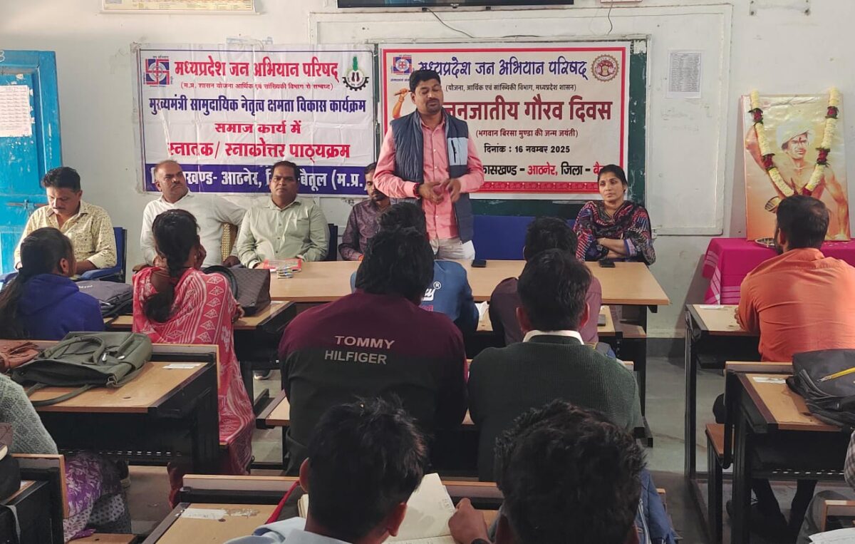 BETUL NEWS/आठनेर। मध्यप्रदेश जन अभियान परिषद के निर्देशन में चलने वाली मुख्यमंत्री सामुदायिक नेतृत्व क्षमता विकास कार्यक्रम आठनेर की कक्षा मे जनजातीय गौरव दिवस अंतर्गत धरती आबा भगवान बिरसा मुंडा की जन्मजयंती का कार्यक्रम उत्साह पूर्वक आयोजित किया गया।कार्यक्रम का शुभारंभ भगवान बिरसा मुंडा की प्रतिमा पर माल्यार्पण एवं दीप प्रज्ज्वलित कर किया गया।कार्यक्रम की भूमिका को मध्यप्रदेश जन अभियान परिषद की विकासखंड समन्वक मधु चौहान द्वारा रखा गया।कार्यक्रम के मुख्य वक्ता जनपद सदस्य राजू सलाम ने उपस्थित छात्राओं को संबोधित करते हुए कहा कि भारतीय स्वतंत्रता आंदोलन के वे महानायक थे जिन्होंने जल-जंगल-जमीन की रक्षा और आदिवासी समाज के अधिकारों के लिए अपना सम्पूर्ण जीवन समर्पित कर दिया।उनके संघर्ष ने न केवल समाज को नई दिशा दी,बल्कि आत्मसम्मान व स्वाभिमान की अलख जगाई।मंच पर उपस्थित परामर्शदाता गोवर्धन राने ने कहा कि आज की पीढ़ी को बिरसा मुंडा के अटूट साहस,संघर्ष और समाजहित में जो कार्य किया उससे सीखने की आवश्यकता है।