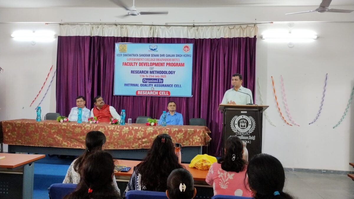 BETUL NEWS TODAY/भैंसदेही (मनीष राठौर):- वीर स्वतंत्रता संग्राम सेनानी श्री गंजन सिंह कोरकू शासकीय महाविद्यालय भैंसदेही में रिसर्च मेथोडॉलॉजी पर आधारित छः दिवसीय फैकल्टी डेवलपमेंट कार्यक्रम संपन्न हुआ। महाविद्यालय के आंतरिक गुणवत्ता आश्वासन प्रकोष्ठ तथा रिसर्च सेल के संयुक्त तत्वाधान में आयोजित यह कार्यक्रम पीएम उषा ( प्रधानमंत्री उच्चतर शिक्षा अभियान) द्वारा प्रायोजित था। प्राचार्य डॉ जितेंद्र कुमार दवंडे ने बताया कि इस कार्यक्रम में विभिन्न विषय विशेषज्ञों ने शोध प्रविधि के विभिन्न पहलुओं से अवगत करवाया।