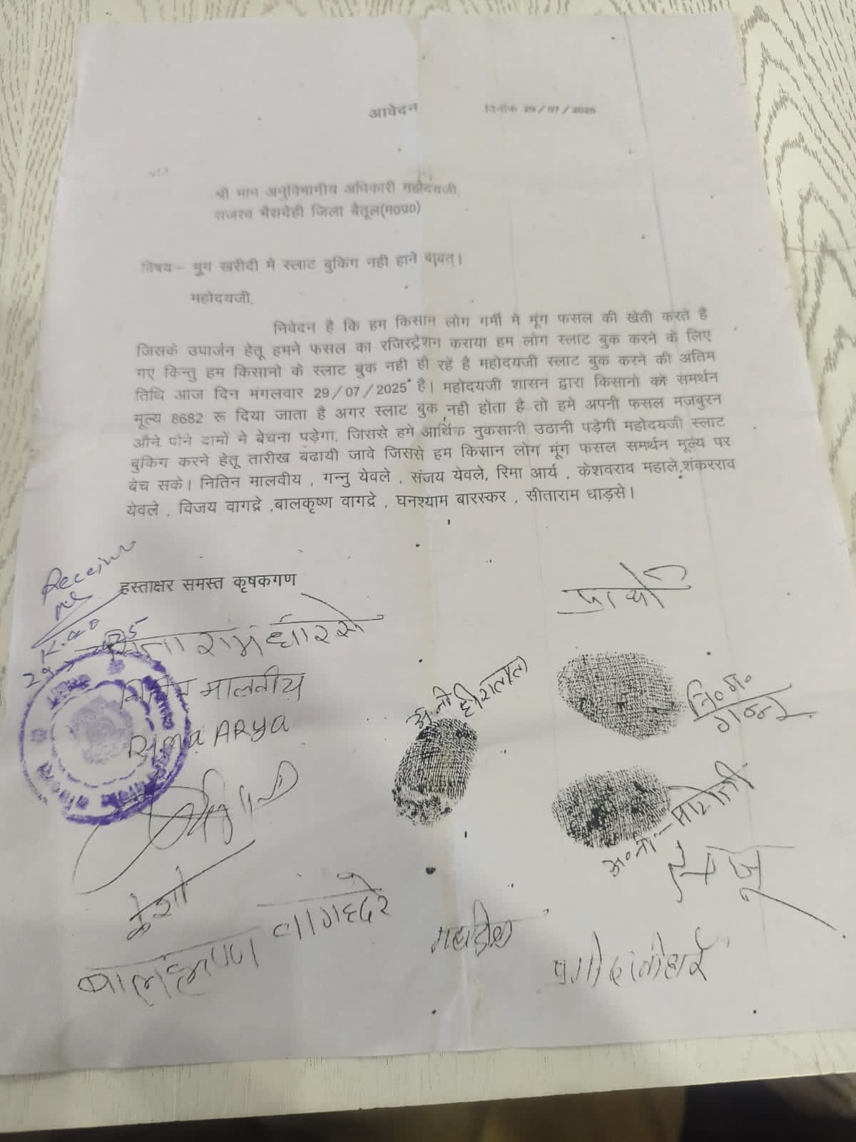 BETUL NEWS TODAY/भैंसदेही(मनीष राठौर) :- भैंसदेही क्षेत्र के किसानों ने अनुविभागीय अधिकारी राजस्व भैंसदेही को एक आवेदन दिया है, जिसमें उन्होंने मूंग खरीदी में स्लाट बुकिंग नहीं होने की समस्या से अवगत कराया है। किसानों ने बताया कि वे गर्मी में मूंग फसल की खेती करते हैं और समर्थन मूल्य पर फसल बेचने के लिए स्लाट बुक करना चाहते हैं, लेकिन स्लाट बुक नहीं हो रहा है।