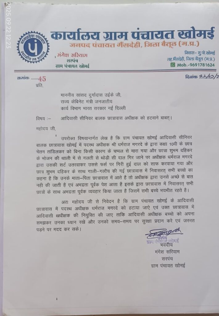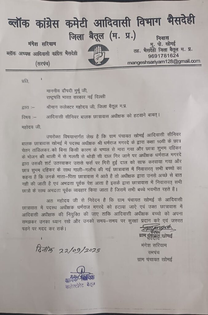 Betul News Today/भैंसदेही (मनीष राठौर):- भैंसदेही की ग्राम पंचायत खोमई के सरपंच एवं आदिवासी कांग्रेस ब्लॉक अध्यक्ष मंगेश सरियाम ने आदिवासी बच्चों के साथ हो रहे अपमानजनक व्यवहार के खिलाफ गंभीर कदम उठाया है। उन्होंने राष्ट्रपति और जनजाति कार्य विभाग मंत्री के नाम एक ज्ञापन सौंपकर खोमई सीनियर बालक छात्रावास में पदस्थ अधीक्षक धर्मराज मगरदे को तत्काल हटाने की मांग की है।अधीक्षक पर गंभीर आरोपज्ञापन में मंगेश सरियाम ने आरोप लगाया है कि अधीक्षक धर्मराज मगरदे ने कक्षा 10वीं के छात्र चेतन तांडिलकर को बिना किसी कारण चप्पल से पीटा। साथ ही, छात्र शुभम दहिकर की थाली से गलती से दाल गिर जाने पर अधीक्षक ने उसकी शर्ट उतारकर फर्श पर गिरी दाल को साफ करवाया और गाली-गलौज की। इस तरह के अमानवीय कृत्य से छात्रावास में भय और अपमान का माहौल बना हुआ है।अन्य विद्यार्थियों ने भी लगाए आरोपछात्रावास में रहने वाले अन्य बच्चों ने भी अधीक्षक के प्रति अभद्रता और दुरुपयोग के आरोप लगाए हैं। बच्चों ने बताया कि जब उनके माता-पिता उनसे मिलने आते हैं, तो अधीक्षक धर्मराज मगरदे उनसे भी अभद्र व्यवहार करता है और सम्मानजनक तरीके से बात नहीं करता।