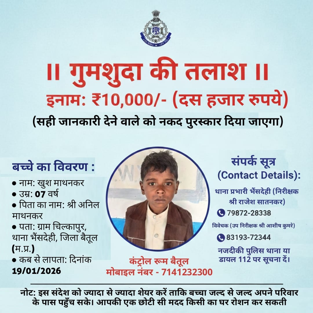 लापता बालक खुश माथनकर की जानकारी पर 10 हजार का इनाम घोषितभैंसदेही। चिल्कापुर (गुदगांव) के अनिल उर्फ गोलू माथनकर का 6 वर्षीय पुत्र खुश माथनकर 19 जनवरी सोमवार शाम 5 बजे से लापता है। परिवार की तलाश नाकाम रहने पर भैंसदेही थाने में गुमशुदगी दर्ज कराई गई।पुलिस ने तलाश तेज कर दी है। भैंसदेही, झल्लार व आठनेर टीमें बैतूल एसपी व एडिशनल एसपी के निर्देश पर सक्रिय हैं, लेकिन अभी सुराग नहीं मिला। परिवार दुखी है। इनाम की घोषणा: सटीक जानकारी देने वाले को 10 हजार रुपये का इनाम। आमजन से अपील की गई है। इससे बच्चे के जल्द मिलने की आशा।