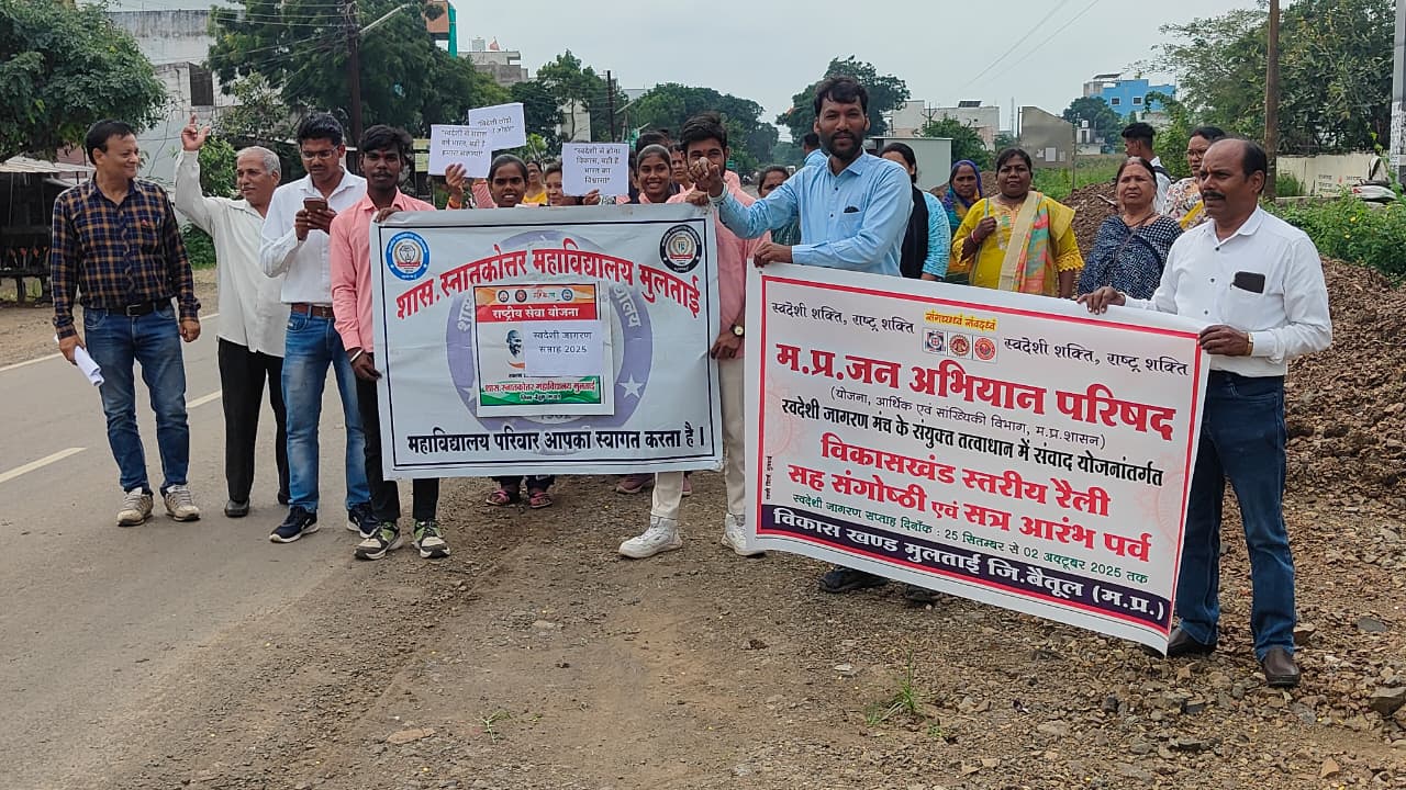 Betul Samachar/मुलताई। शासकीय महाविद्यालय में 25 सितम्बर को स्वदेशी जागरण सप्ताह के अंतर्गत एक भव्य स्वदेशी जागरूकता रैली का आयोजन किया गया। इस अवसर पर उपस्थित शिक्षकगण एवं विद्यार्थियों ने आत्मनिर्भर भारत और स्वदेशी उत्पादों के उपयोग का संकल्प लिया। कार्यक्रम संयोजक प्रो. तारा बारस्कर ने विद्यार्थियों को संबोधित करते हुए कहा कि आज राष्ट्र की प्रगति स्वदेशी और आत्मनिर्भरता से ही संभव है। उन्होंने स्थानीय उत्पादों को अपनाने और विदेशी वस्तुओं पर निर्भरता कम करने का संदेश दिया। रैली का संचालन एन.एस.एस. प्रभारी डॉ. एल.एल. राउत ने किया। उन्होंने छात्रों को अनुशासन और रैली के उद्देश्य के संबंध में मार्गदर्शन दिया। महाविद्यालय के छात्र-छात्राएँ हाथों में “स्वदेशी अपनाओ”, “आत्मनिर्भर भारत”, “स्थानीय उत्पाद बढ़ाओ” जैसे नारे लिखी तख्तियाँ लेकर नगर के मुख्य मार्गों से निकले। रैली के दौरान पूरे नगर में देशभक्ति और स्वदेशी चेतना का वातावरण बना रहा। नगरवासियों ने रैली का स्वागत करते हुए विद्यार्थियों के उत्साह की सराहना की।