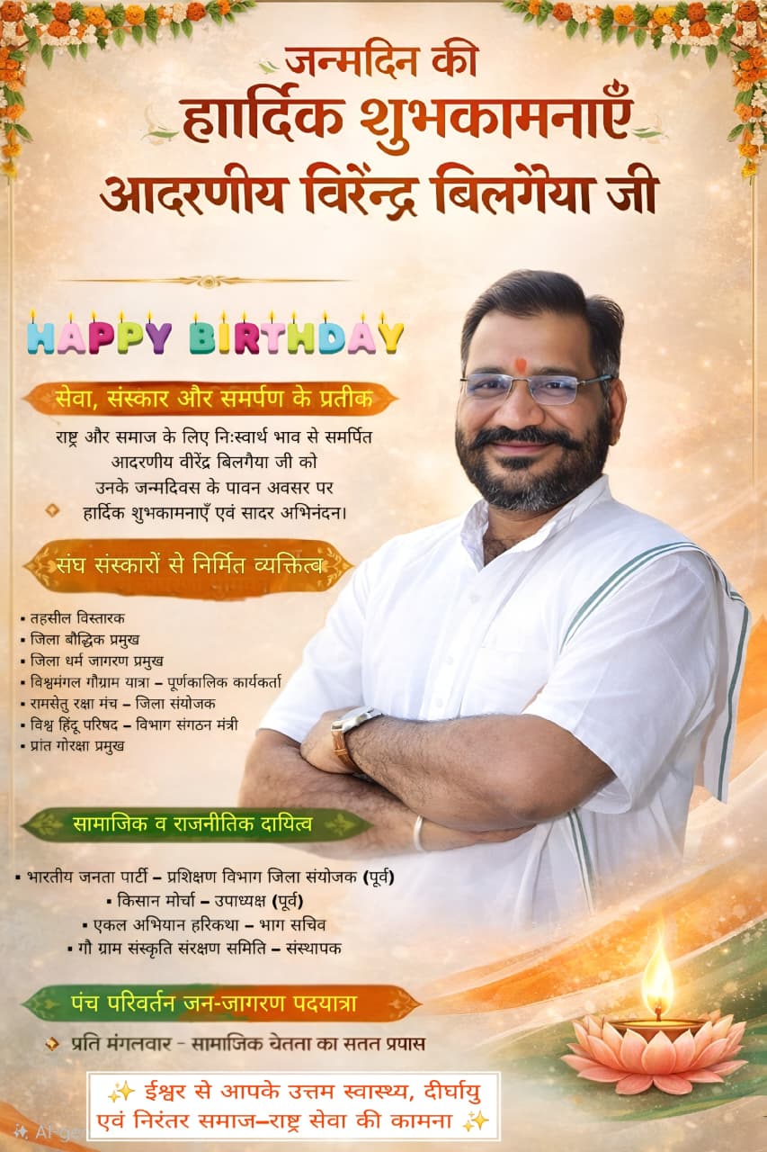 Betul Samachar/मनीष राठौर:- जब कोई व्यक्ति बिना किसी अपेक्षा के समाज और राष्ट्र के लिए अपना संपूर्ण जीवन समर्पित कर देता है, तो उसका जीवन स्वयं एक प्रेरक संदेश बन जाता है। सेवा, संस्कार और राष्ट्रनिष्ठा के इन्हीं मूल्यों को अपने आचरण और कर्म से जीने वाले वीरेंद्र बिलगैया जी को उनके जन्मदिवस के अवसर पर समाचार माध्यम के माध्यम से हार्दिक शुभकामनाए एवं सम्मान व्यक्त किया जा रहा है। उनका जीवन निःस्वार्थ सेवा, अनुशासन और राष्ट्रभक्ति का सशक्त उदाहरण है।