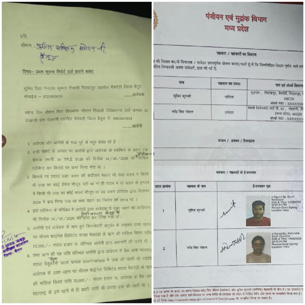Betul Samachar News/भैंसदेही/मनीष राठौर :- भैंसदेही अंतर्गत आने वाले ग्राम चिल्कापुर निवासी सुमित कुम्भारे ने एसपी से शिकायत कर विवेकानंद वार्ड क्रमांक 02, ग्राम पोखरनी निवासी महेन्द्र सिंह चौहान के विरुद्ध एफआईआर दर्ज करने की मांग की है। शिकायत में कहा गया कि आवेदक और अनावेदक के बीच पूर्व से मधुर संबंध रहे हैं। इन्हीं संबंधों के आधार पर अनावेदक ने 14 मई 2025 को लिखित एग्रीमेंट कर आवेदक के स्वामित्व वाला ट्रक क्रमांक एमपी 04 एचई 5126 किराये पर लिया था। वाहन की स्थिति पूरी तरह ठीक थी और उसका निर्माण वर्ष 2019 का था। अनुबंध के अनुसार श्रीराम फाइनेंस लिमिटेड भैंसदेही शाखा की 70 हजार रुपये मासिक किश्त अनावेदक को आवेदक के बैंक ऑफ महाराष्ट्र खाते में जमा करनी थी, जिससे वाहन की ईएमआई कटती थी।