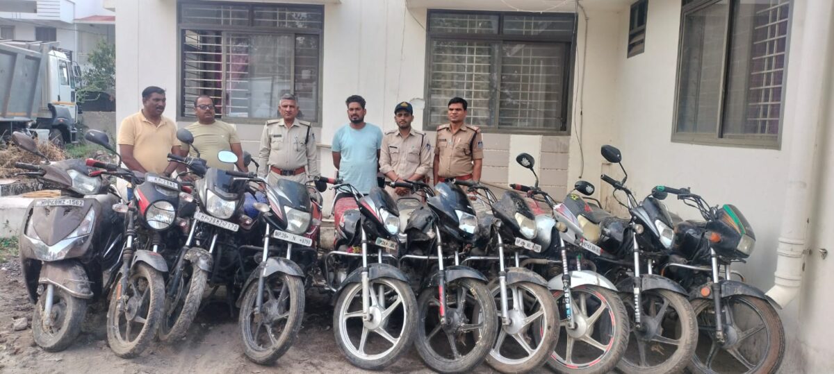 Crime News/मुलताई। दुनावा रोड पर स्थित ग्राम लेंदागोंदी में एक युवक ने खेत में बने भैंस के तबेले में 9 बाईक और एक स्कूटी छिपाकर रखे थे। मुखबीर की सूचना पर पुलिस जब मौके पर पहुंची तो युवक भागने लगा जिसे घेराबंदी करके जब वाहनों के कागजात पूछे गए तो वह नही बता सका। पुलिस द्वारा आरोपी पंकज पिता हीराचंद पंवार उम्र 31 वर्ष पर वाहनों को जब्त कर चोरी का प्रकरण दर्ज किया गया। पुलिस ने बताया कि भैंस के तबेले में अलग अलग कंपनियों की बाईक और एक स्कूटी मिली है जिनके कागजात आरोपी के पास नही मिले जिससे स्पष्ट है कि उक्त वाहन चोरी करके लाए गए हैं। थाना प्रभारी नरेन्द्र सिंह परिहार ने बताया कि गश्त के दौरान मुखबीर से सूचना मिली थी जिसके आधार पर ग्राम लेंदागोंदी में स्थित खेत में बने तबेले में वाहन नजर आए। वाहनों की कीमत लगभग 6 लाख 60 हजार बताई जा रही है। पुलिस के अनुसार जब्त की गई बाईकों में बाईक सीडी 100 एमपी 28 एनडी 3028, हीरो कंपनी की बिना नंबर, हीरो एचएफ डीलक्स एमपी 28 एमयू 2253, सुपर स्प्लेंडर बिना नंबर, पैशन प्रो एमपी 28 एन 8799, स्कूटी क्रमांकएमपी 48 एम जेड 1562, स्प्लेंडर प्लस एमपी 28 एनएफ 2384, एचएफ डीलक्स एमपी 28 सी 1733, बजाज प्लेटिना एमपी 28 एमजेड 7170 तथा एचएफ डीलक्स एमपी 28 एमआर 0613 जब्त की गई है। उक्त कार्रवाइ मे थाना प्रभारी सहित पुलिस टीम की महत्वपूर्ण भूमिका रही।