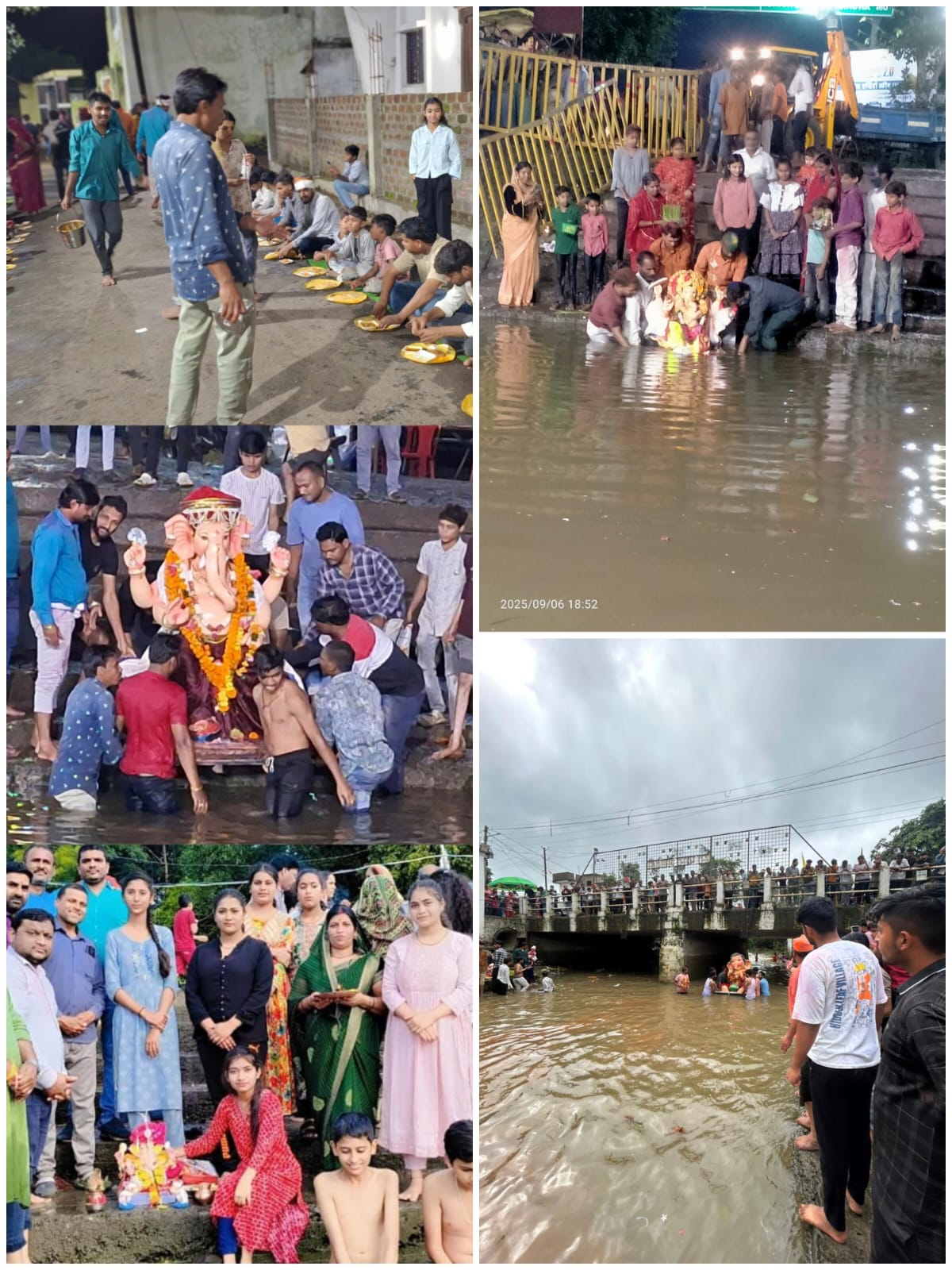 Ganesh Visarjan 2025/भैंसदेही (मनीष राठौर) :- भैंसदेही पूर्णा की नगरी भैंसदेही में गणेश प्रतिमाओं के विसर्जन का कार्यक्रम हर्षोल्लास और सामाजिक सौहार्द में संपन्न हुआ। नगर परिषद द्वारा प्रतिमाओं के विसर्जन के लिए घाटो पर व्यापक व्यवस्था की गई थी, जहां नगर परिषद अध्यक्ष मनीष सोलंकी, सीएमओ रीना राठौर द्वारा निरीक्षण कर व्यवस्थाओं का निरंतर जायजा लिया गया। इस वर्ष भी नगर परिषद ने शिव मंदिर के पास पूर्णा नदी पर बोरी बंधान एवं लाइटिंग एवं साफ-सफाई पहले ही करवा दी थी, जहां शनिवार और रविवार देर रात तक गणेश प्रतिमाओं का विसर्जन हुआ। नगर से 5 किमी दूरी पर स्थित देवलवाड़ा के पास माँ पूर्णा के तट पर जहां कार्तिक पूर्णिमा पर विशाल मेले का आयोजन किया जाता है, यहां पर जनपद पंचायत भैसदेही के जनपद सदस्य ऋषभदास सावरकर द्वारा पूर्णा नदी के दोनों तटो पर कांक्रीट की सीढ़िया और कांक्रीट का बेस डालकर जीर्णोद्धार किया गया है। जिसका उदाहरण इस वर्ष देखने को मिला। इस वर्ष पूर्णा नदी पर भैंसदेही क्षेत्र के अलावा आसपास के ग्रामों के भी लोगों ने भगवान गणेश की प्रतिमाओं का विसर्जन किया।
