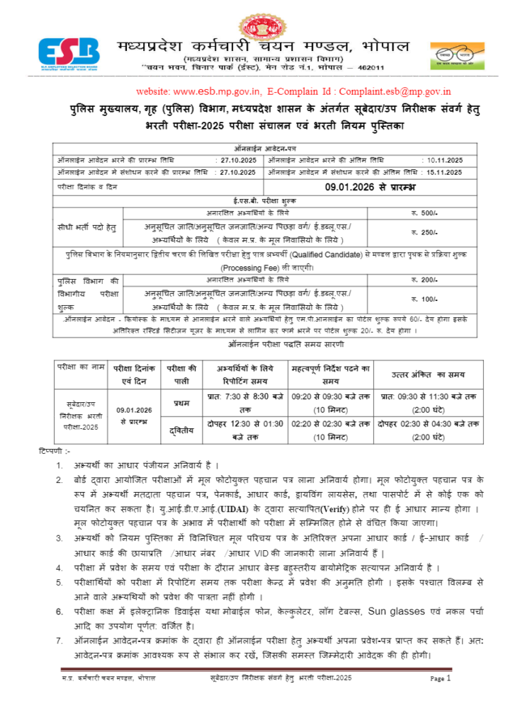 MP Police Recruitment 2025:- मध्य प्रदेश कर्मचारी चयन मंडल ने पुलिस मुख्यालय में सूबेदार और उप निरीक्षक पदों पर भर्ती (MP Police Recruitment 2025) के लिए नोटिफिकेशन जारी किया है। जिसके मुताबिक आवेदन प्रक्रिया 27 अक्टूबर 2025 से शुरू होगी। उम्मीदवार ऑफिशियल वेबसाइट http://esb.mp.gov.in/ पर जाकर 10 नवंबर 2025 तक ऑनलाइन आवेदन कर पाएंगे। इससे पहले सभी कैंडिडेट्सयह सुनिश्चित कर लें कि वे पात्र हैं या नहीं। फॉर्म भरने से पहले नोटिफिकेशन पढ़ने की सलाह दी जाती है। उम्मीदवारों को आवेदन में सुधार का मौका 15 नवंबर तक मिलेगा।