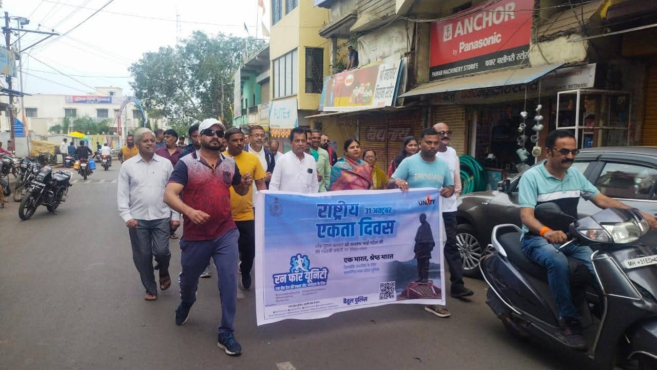 National Unity Day/मुलताई। भारत के प्रथम गृहमंत्री लौह पुरुष सरदार वल्लभभाई पटेल की 150वीं जयंती के अवसर पर 31 अक्टूबर शुक्रवार की सुबह हाई स्कूल ग्राउंड से राष्ट्रीय एकता दौड़ का आयोजन किया गया। कार्यक्रम में क्षेत्र के विधायक चंद्रशेखर देशमुख मुख्य अतिथि के रूप में उपस्थित रहे। कार्यक्रम में नगरपालिका अध्यक्ष वर्षा गढ़ेकर, एसडीएम, एसडीओपी एस.के. सिंह, तहसीलदार, थाना प्रभारी, भाजपा नगर मंडल अध्यक्ष गणेश साहू, अधिवक्ता संघ अध्यक्ष एस.के. चंदेल सहित अनेक जनप्रतिनिधि, अधिकारीगण, भाजपा पदाधिकारी, बड़ी संख्या में स्कूली विद्यार्थी एवं नागरिक शामिल हुए। एकता दौड़ हाई स्कूल ग्राउंड से प्रारंभ होकर बस स्टैंड, जयस्तंभ चौक, मुख्य मार्ग होते हुए फव्वारा चौक तक संपन्न हुई। समापन स्थल पर उपस्थित सभी प्रतिभागियों को राष्ट्रीय एकता और “एक भारत श्रेष्ठ भारत” का संकल्प दिलाया गया। इस अवसर पर वक्ताओं ने सरदार पटेल के योगदान को याद करते हुए कहा कि उनके आदर्शों पर चलते हुए हमें देश की एकता, अखंडता और समरसता को बनाए रखने का संकल्प लेना चाहिए।