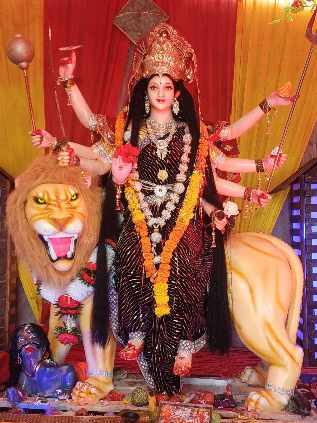 Navratri 2025/भैंसदेही:- झल्लार में न जगदम्बे की तीसरी प्रतिमा जो कि बैतूल – परतवाडा मार्ग पर पुलिस थाने के सामने बजरंग मंदिर में भी मां भवानी की प्रतिमा विराजित की गई है, लगभग सन 2006 से (19 वर्षों) से मूर्ति स्थापना की का रही है, प्रतिदिन सुबह शाम नंगाड़े से आरती की जाती है तथा महानवमी पर हवन एवं भंडारे का कार्यकम किया जाता है। लगभग सैंकड़ों की संख्या में यहां लोग पूजा अर्चना करते है , मूर्ति समिति द्वारा भैंसदेही से लाई गई है, खड़े शेर पर राक्षस का वध करते हुए प्रतिमा विराजित की गई है तथा धूम धाम से दशहरा पर विसर्जन किया जाएगा।
