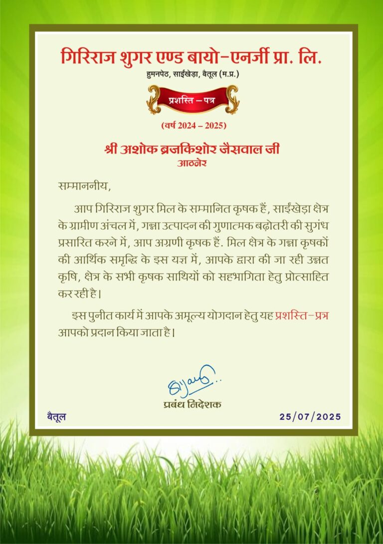 Betul Local News:- आठनेर नगर के बहु प्रतिष्ठित गन्ना किसान अशोक बृजकिशोर जायसवाल को गिरिराज शुगर एण्ड बायो एनर्जी प्राइवेट …
